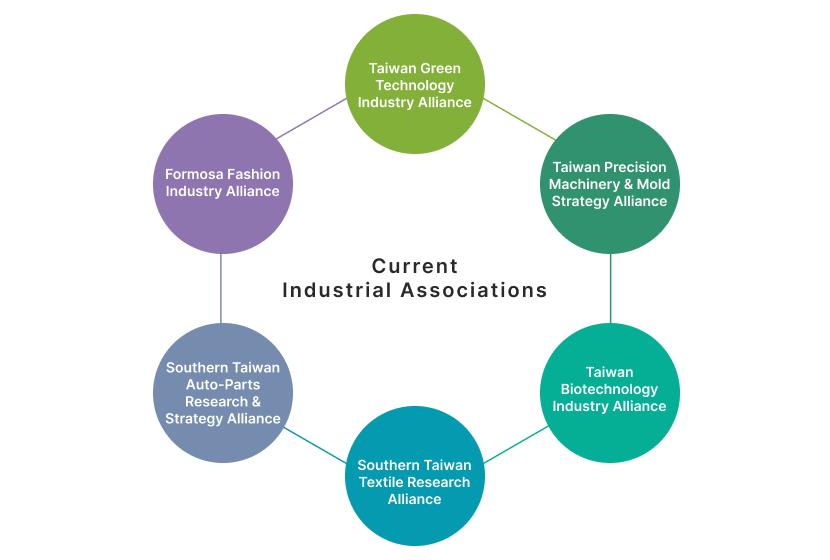 Taiwan Green Technology Industry Alliance、Taiwan Precision Machinery & Mold Strategy Alliance、Taiwan Biotechnology Industry Alliance、Southern Taiwan Texile Research Alliance、Southern Taiwan Auto-Parts Research & Strategy Alliance、Formosa Fashion Industry Alliance