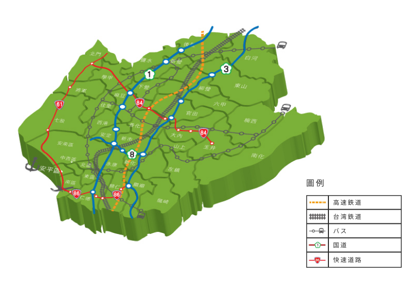 便利な交通ネットワークには、国際空港、ビジネス港、鉄道システム、外部高速道路、市内交通機関 (完全な台南バスシティ) が含まれます。