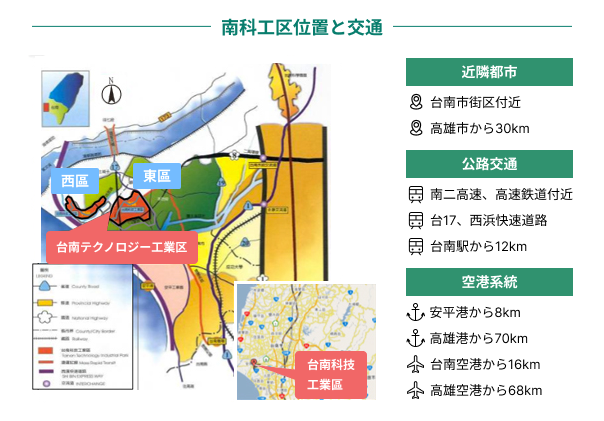 南科工区位置と交通 ‧近鄰都市 (1)台南市街区付近 (2)高雄市から30km ‧公路交通 (1)南二高速、高速鉄道付近 (2)台17、西浜快速道路 (3)台南駅から12km ‧空港系統 (1)安平港から8km (2)高雄港から70km (3)台南空港から16km (4)高雄空巷から68km