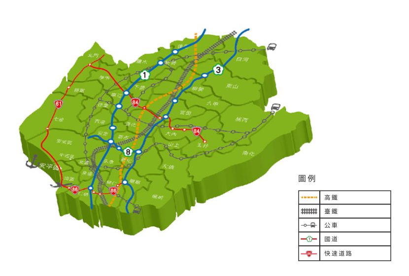 便捷交通網附近擁有國際機場、商務港埠、鐵路系統、聯外公路、市內運輸(完善的大臺南公車城)