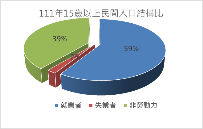 非勞動力佔39%;就業者佔59%;失業者佔2%