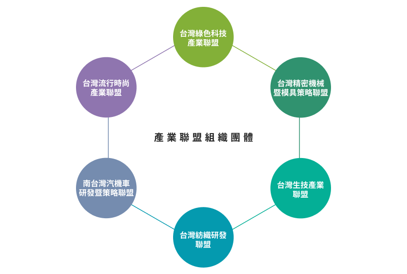 此圖顯示現有產業聯盟組織團體有:台灣綠色科技產業聯盟、台灣精密機械暨模具策略聯盟、台灣汽機車研發暨策略聯盟、台灣生技產業聯盟、南台灣紡織研發聯盟、台灣流行時尚產業聯盟。