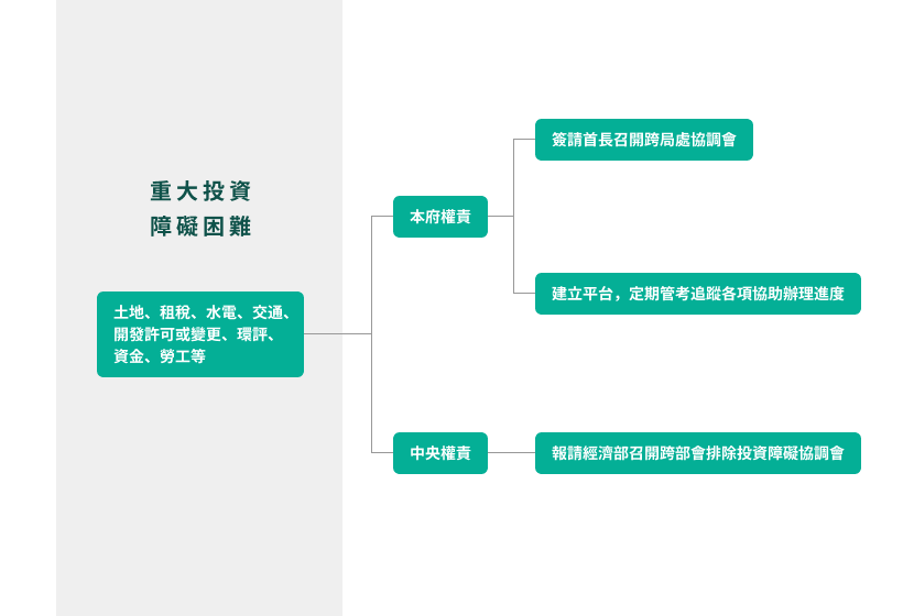 重大投資障礙困難(土地、租稅、水電、交通、開發許可或變更、環評、資金、勞工等)分二部分: 一、本府權責: